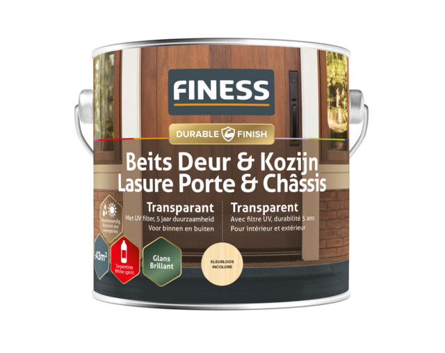 Finess Tür- und Rahmenlasur Transparent ist eine strapazierfähige, feuchtigkeitsregulierende, wasserabweisende, glänzende Lasur mit UV-Filter auf Terpentinbasis. Sie bietet bis zu 5 Jahre Schutz für alle Holzkonstruktionen wie Fenster, Türen und Fassadenverkleidungen. Die Lasur dringt gut ins Holz ein, haftet hervorragend und ist äußerst witterungsbeständig. Die Farbe des Holzes und eventuell vorhandener transparenter Holzschutzschichten beeinflussen das Endergebnis. Da farblose Lasur keine Farbpigmente enthält, ist sie weniger UV-beständig und erfordert daher häufigere Pflege. Da transparente, farblose Beize keine Farbpigmente enthält, ist sie weniger beständig gegen UV-Strahlung und erfordert daher eine häufigere Nachbehandlung.