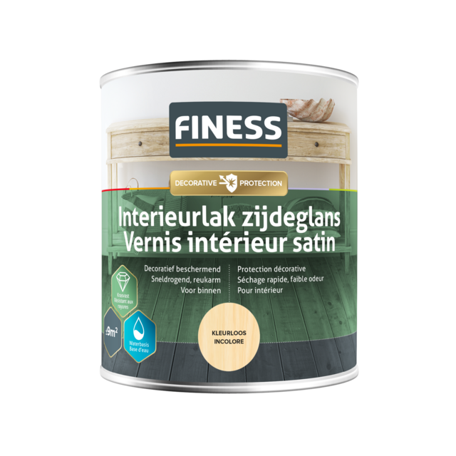 Finess Interieurlak Zijdeglans is een kras- en stootvaste transparante lak op waterbasis. Voor het afwerken van (onbehandelde) houten meubels, deuren en kozijnen, plinten, lambriseringen en ander timmerwerk binnenshuis. Beschermt tegen vocht en vlekken en accentueert de houtnerf. Sneldrogend, geur- en oplosmiddelarm. De uiteindelijke kleur is afhankelijk van het soort hout en aantal lagen. Stofdroog na ± 1 uur en overschilderbaar na ± 4 uur. De krasvastheid is, afhankelijk van de kleur, na 15-30 dagen bereikt.