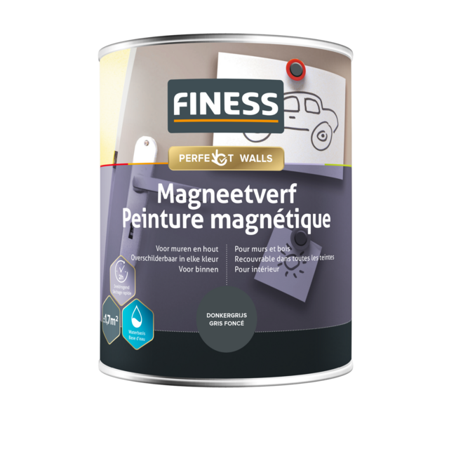 Donkergrijze verf met ijzerdeeltjes waardoor magneten worden aangetrokken. Maak een memobord van iedere muur of deur! Overschilderbaar met elke gewenste kleur muur- of schoolbordverf.