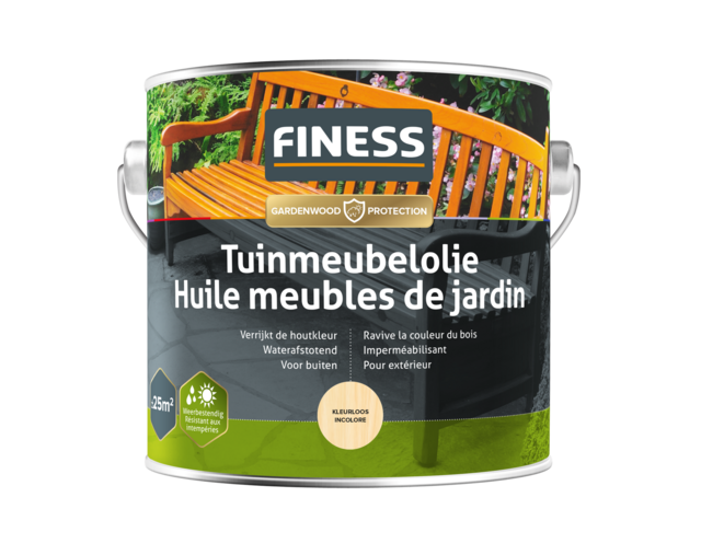 Een onderhoudsproduct op basis van natuurlijke oliën.Toepasbaar op houten objecten die door weersinvloeden zijn vergrijsd, zoals hardhouten tuinmeubelen, teak, rotan, riet en bamboe. Tuinmeubelolie voedt het hout en brengt in de natuurlijke kleur terug. Het dringt diep in de poriën van het hout en voorkomt vergrijzing.
