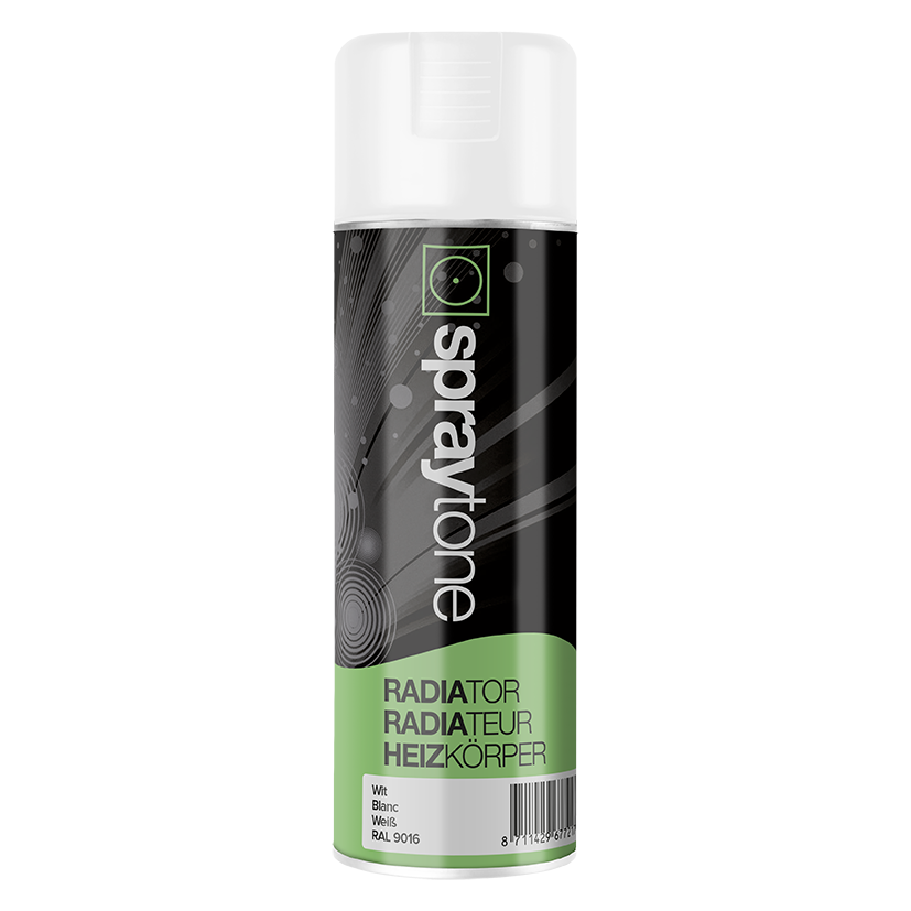 High gloss spray paint for radiators and central heating pipes. Heat resistant up to 80°C. Excellent for hard to paint surfaces such as radiators (not cast iron) and heating pipes. For interior use. The surface must be clean, dry and free of grease. Remove any rust and flaking paint layers first before sanding. Mask off the surrounding area. Apply a basecoat with SPRAYTONE Primer to untreated metal.